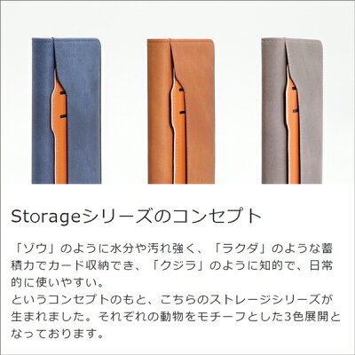 ご希望の場合はこちらへStrageシリーズのコンセプト 「ゾウ」のように水分や汚れ強く、「ラクダ」のような蓄積力でカード収納でき、「クジラ」のように知的で、日常的に使いやすい。